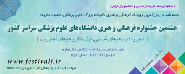 هشتمین جشنواره فرهنگی ویژه اعضای هیات علمی، کارکنان و دانشجویان دانشگاه های علوم پزشکی کشور برگزار می شود.
