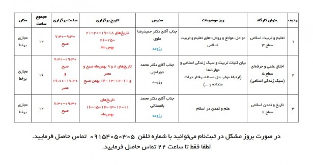 به گزارش روابط عمومی نهاد نمایندگی دانشگاه علوم پزشکی مشهد، دوره های پیش بینی شده در این طرح شامل 3 دورهی " تعلیم و تربیت اسلامی ( سطح3 )، اخلاق علمی و حرفه ای (سطح5) و تاریخ و تمدن اسلامی (سطح 2) می باشد که از تاریخ 8 الی 26 بهمن ماه، در قالب کارگاه های 12 تا 16 ساعته و بصورت آنلاین در سایت وبینار دانشگاه علوم پزشکی مشهد برگزار خواهد شد.