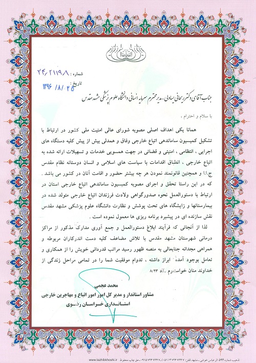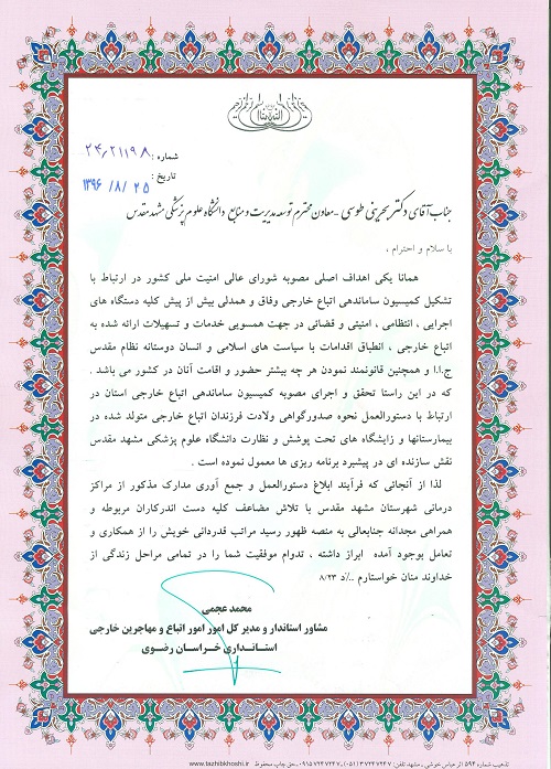 مشاور استاندار و مدیر کل امور اتباع و مهاجرین خارجی  خراسان رضوی از دانشگاه علوم پزشکی مشهد قدردانی نمود.