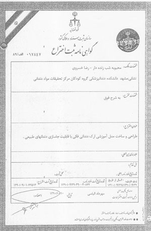 گفتنی است : اختراع طراحی و ساخت مدل آموزشی ارک دندانی فکی با قابلیت جاسازی دندانهای طبیعی با شماره 72513 در اداره ثبت اختراعات به ثبت رسیده است .