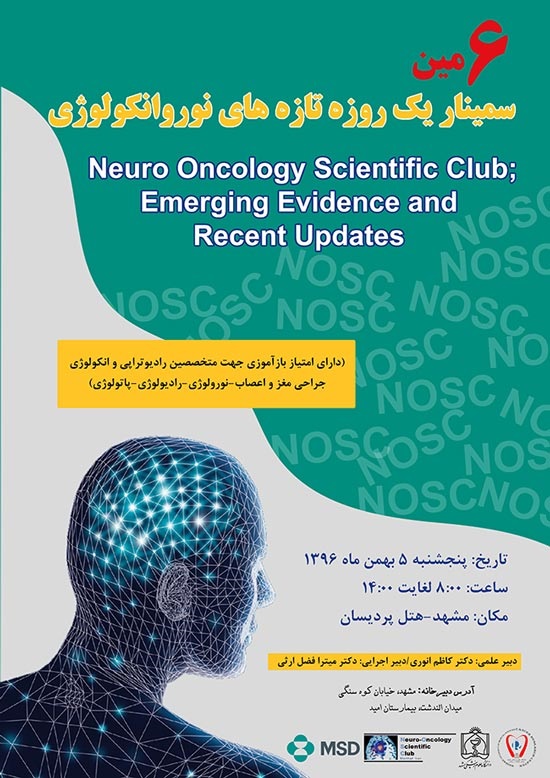 ششمین سمینار علمی یک روزه تازه های نوروانکولوژی با هدف رایزنی و تبادل نظر و بررسی آخرین یافته های مربوط به تشخیص و درمان تومورهای مغزی به میزبانی دانشگاه علوم پزشکی مشهد برگزار می شود.