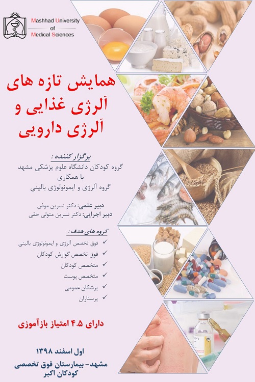 نخستین دوره سمینار تازه های آلرژی غذایی و آلرژی دارو با حضور اساتید گروه آلرژی و ایمونولوژی به میزبانی بیمارستان فوق تخصصی کودکان اکبر از مراکز زیر پوشش دانشگاه علوم پزشکی مشهد برگزار می شود.