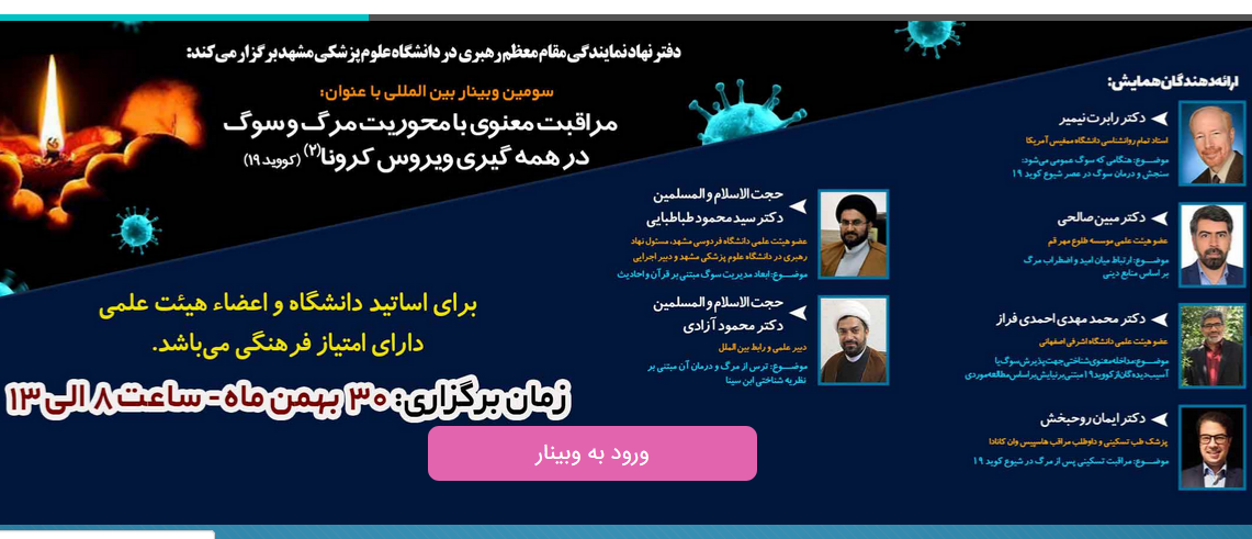 سومین وبینار میان رشته ای"مراقبت معنوی با محوریت مرگ و سوگ در همهگیری کووید19" ،با حضور اساتید و صاحبنظرانی از داخل و خارج کشور برگزار شد.