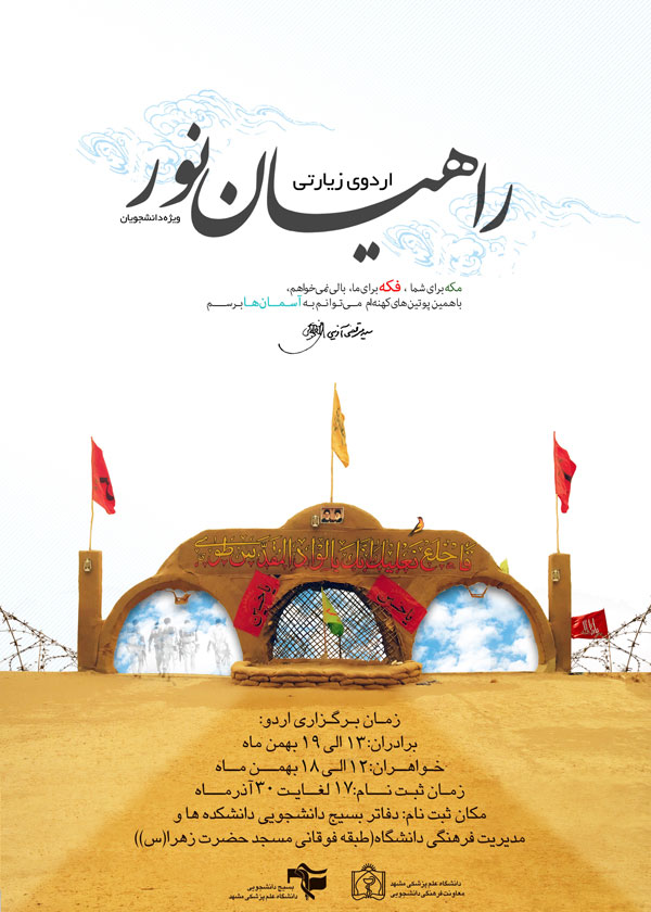 به گزارش وب دا ،ستاد راهیان نور دانشگاه علوم پزشکی مشهد اعلام کرد : دانشجویان تا 30 آذر ماه مي توانند براي نام نويسي به دفاتر بسیج دانشجویی دانشکده ها و مدیریت فرهنگی دانشگاه مراجعه کنند .