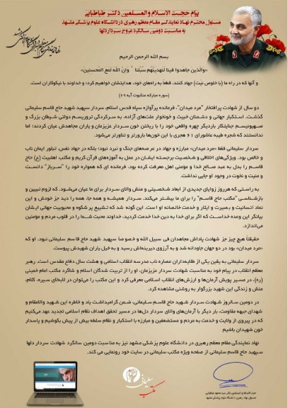 در آستانه دومین سالگرد عروج سردار دلها؛ شهید حاج قاسم سلیمانی، مسئول نهاد رهبری دانشگاه علوم پزشکی مشهد با صدور پیامی ضمن پاسداشت یاد و خاطره آن اسطورهی اخلاص و مجاهدت، از راه اندازی صفحه " مکتب سلیمانی" در سایت دفتر نهاد نمایندگی مقام معظم رهبری در دانشگاه علوم پزکی مشهد خبر داد؛ متن کامل پیام حجت الاسلام والمسلمین دکتر طباطبایی بدین شرح است: