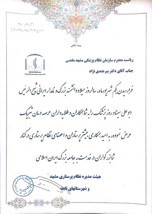 رییس دانشگاه علوم پزشکی مشهد ضمن تبریک زاد روز دانشمند بزرگ و طبیب برجسته و نامدار ایرانی، شیخ‌الرئیس ابوعلی سینا به تمامی پزشکان استان خراسان رضوی آورده است: در فرهنگ غنی ایران اسلامی پزشکان فرهیخته ای تربیت شده اند که با از خود گذشتگی و ایثار  برای ارتقاء سلامت جامعه می کوشند و در بحبوحه تحریم های ناجوانمردانه، برای نشاندن طعم شیرین لبخند رضایت و سلامت بر لبان‌ بیماران لحظه ای از تلاش دست بر نمی دارند.