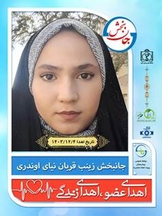 مسئول واحد فراهم آوری اعضای پیوندی دانشگاه علوم پزشکی مشهد در گفتگو با وب دا اظهار کرد: در یکهزار و ششصد و بیست و یکمین عمل اهدای عضو از اهدا کننده مرگ مغزی ؛زینب قربان نیای اوندری 18 ساله ؛ كه از بیمارستان حضرت ابوالفضل کاشمر به واحد فراهم آوری اعضای پیوندی در مرکز پیوند اعضای دانشگاه مشهد معرفی شد، پس از دریافت رضایت از خانواده اش، در بیمارستان منتصریه تحت عمل جراحي اهدای عضو قرار گرفت .
