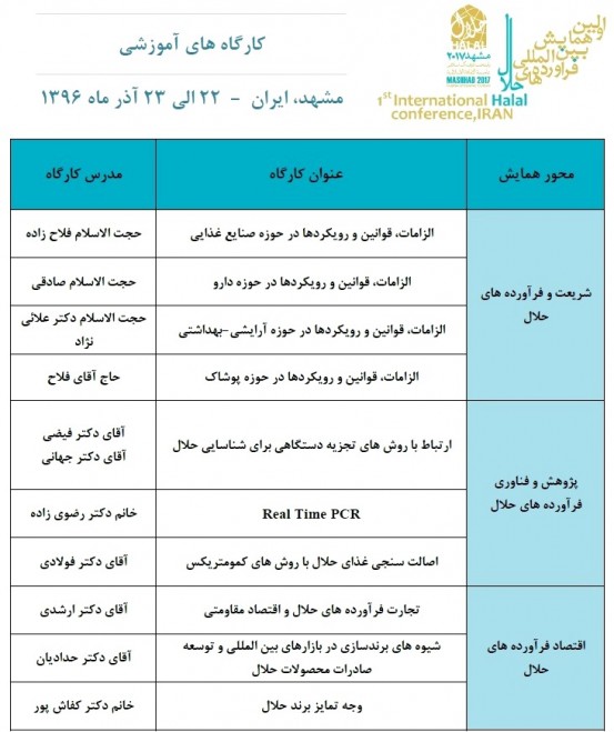در راستای گسترش فرهنگ محصولات حلال در گستره ملی_منطقه ای، ده کارگاه تخصصی در حاشیه برگزاری اولین همایش بین المللی فرآورده های حلال به ميزباني دانشگاه علوم پزشکي مشهد، برگزار مي شود.
