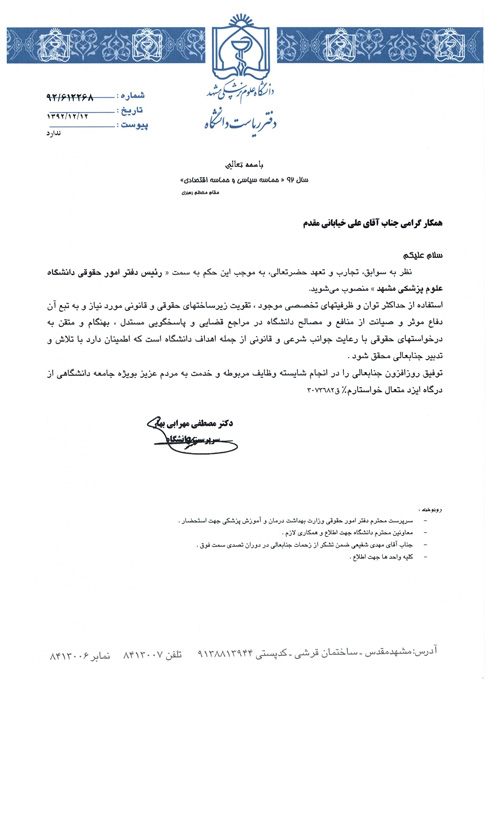 در بخشي از اين حکم آمده است :استفاده از حداکثر توان وظرفیتهای تخصصی موجود ، تقویت زیرساختهای حقوقی وقانونی مورد نیاز به تبع آن دفاع موثر وصیانت از منافع و مصالح دانشگاه درمراجع قضایی و پاسخگویی مستدل ، بهنگام و متقن به درخواستهای حقوقی با رعایت جوانب شرعی و قانونی از جمله اهداف دانشگاه است که اطمینان دارد با تلاش و تدبیر جنابعالی محقق شود .