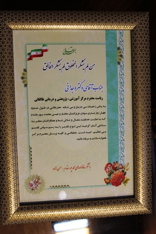 وی با چشمانی اشکبار ضمن قدردانی از تمامی مسئولان و پرسنل بیمارستان و همچنین معاونت درمان دانشگاه علوم پزشکی مشهد لوح تقدیری را تقدیم رییس بیمارستان و پزشکان معالج فرزندانش کرد.