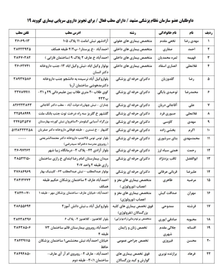 با مشارکت سازمان نظام پزشکی مشهد، 21مطب پزشک متخصص و عمومی برای ارائه خدمات سرپایی به بیماران مبتلا به کووید- 19 در مشهد فعال شده است.