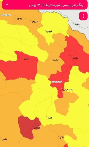 دکتر محمد پهلوان در گفتگو با وب دا خاطر نشان کرد: بر اساس اعلام نرم افزار ماسک وزارت بهداشت درمان و آموزش پزشکی، شهرستان های مشهد، سبزوار، بینالود(طرقبه و شاندیز) و تربت حیدریه در وضعیت قرمز، همچنین نیشابور، تربت جام، تایباد، رشتخوار، چناران،کلات،سرخس، تربت جام، بردسکن در شرایط نارنجی و سایر مناطق استان در وضعیت زرد قرار دارند.